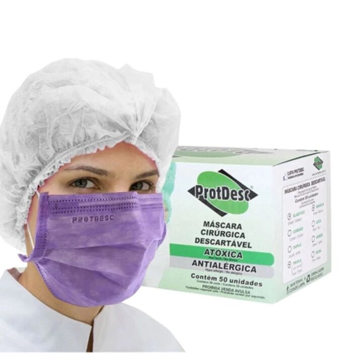 A Máscara Cirúrgica Tripla Lilás Protdesc foi desenvolvida para proporcionar proteção, conforto e higiene em ambientes profissionais da área da saúde, estética, veterinária e beleza.